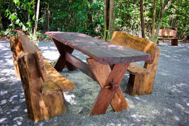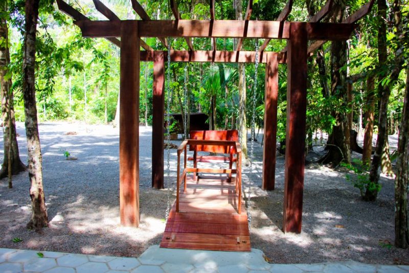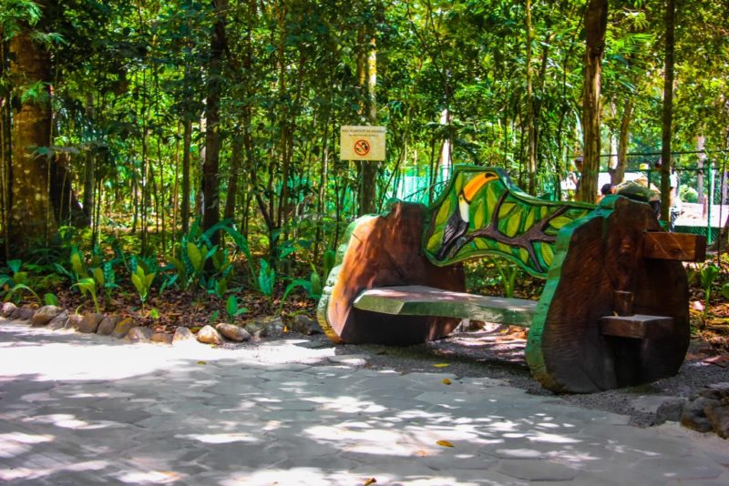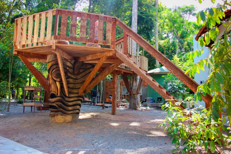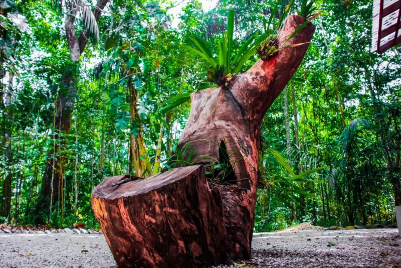 Considerado o maior parque em área urbana da Região Norte, o espaço inovador de turismo sustentável traz o reaproveitamento de materiais por todos os cantos. A queda de sete angelins, por exemplo, deram vida a uma das novidades do parque, que é a casa na árvore, além de um coreto, totens e esculturas de animais. Já as dezenas de bancos e mesas que compõem diversos ambientes foram feitos com madeira doada e também retiradas do rio Amazonas, por meio do projeto Viva Orla da Secretaria Municipal de Meio Ambiente. Todo esse material ganha vida nas mãos dos artesãos, que vão esculpindo e dando forma ao novo parque.