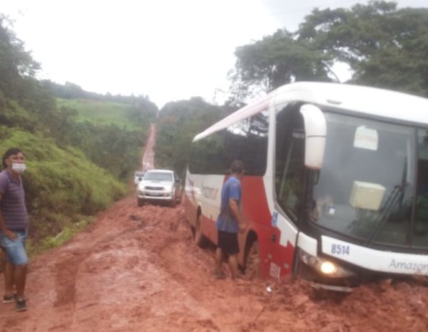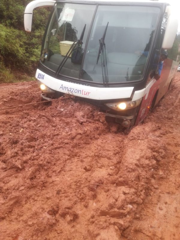 Há duas semanas, um ônibus que tentava atravessar um atoleiro no Km 65 saiu para fora da pista e ficou preso numa cratera. Os passageiros tiveram de ser transportados em outro ônibus.