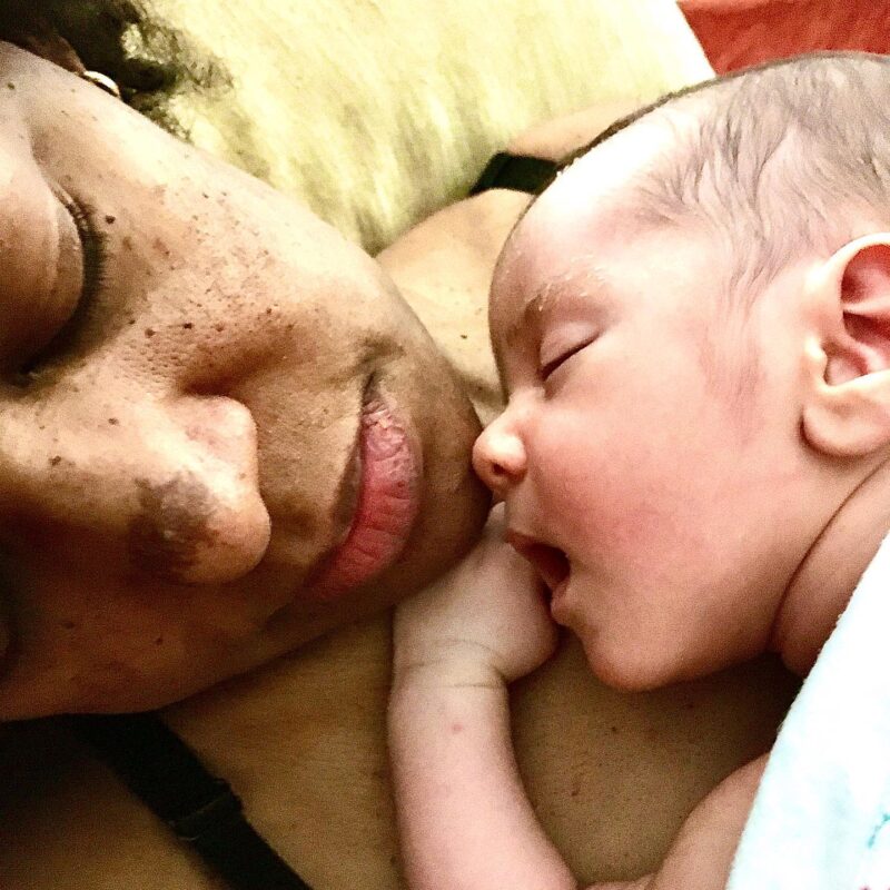 No momento, estamos enfrentando um desafio. Após mamar ou quando está com cólicas, Joaquim adora ficar na posição semifetal, em cima da barriga da mãe. Com o contato pele a pele, a pulsação do coração bem próxima, a respiração, a segurança e o conforto que esse contato passa, Joaquim fica horas ali e não gosta de ser incomodado. Perde a serenidade, chora, esperneia e só cala quando o recolocam na posição.