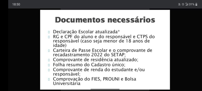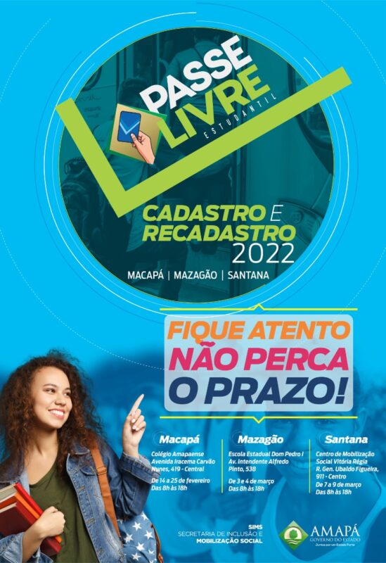 O governo do Estado inicia no dia 14 de fevereiro, segunda-feira, o procedimento de atualização cadastral do programa Passe Livre Estudantil (PLE). Os documentos necessários para o cadastramento são: declaração escolar atualizada, resumo do CadÚnico, RG e CPF do aluno e do responsável, comprovante de residência atualizado, comprovante de renda ou carteira de trabalho, comprovante do FIES, PROUNI ou Bolso Universitária além da carteira de meia-passagem com o comprovante de recadastro 2022. Só poderá ser inserido no programa de Passe Livre quem possuir o benefício da meia-passagem, cujo cadastramento está sendo feito pelo Sindicato das Empresas de Transportes de Passageiros do Amapá (Setap) desde 10 de janeiro e encerra em 29 de abril.