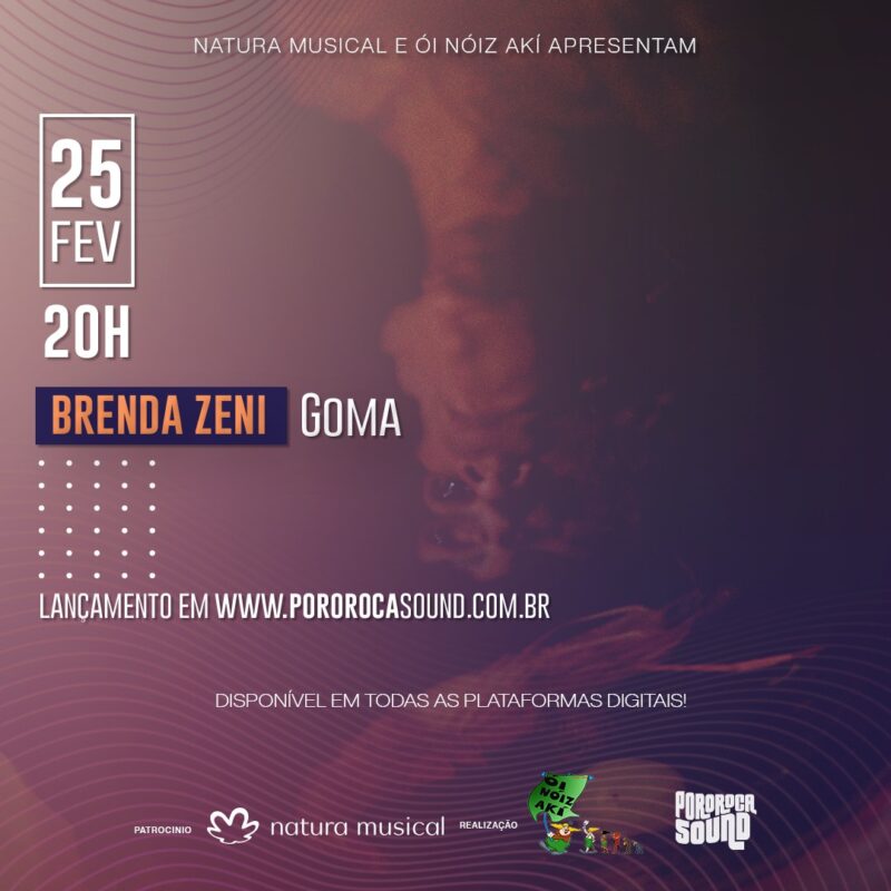 Aterriza nas plataformas de streaming o primeiro disco completo de Branda Zeni. Chamado “Goma”, ele chega nesta sexta-feira (25) para integrar a coletânea da Pororoca Sound, produção da Ói Nóiz Akí, patrocinada pelo programa Natura Musical.