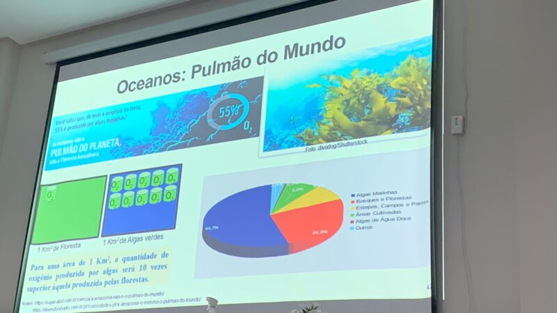 Outro aspecto interessante abordado pelo Almirante diz respeito ao papel dos oceanos na produção de oxigênio para o planeta. “Costumamos dizer que a Amazônia é o pulmão do mundo, mas, na verdade, são os oceanos. Você sabia que, de todo o oxigênio da terra, 55% é produzido por algas marinhas. Para uma área de 1km2, a quantidade de oxigênio produzida por algas será dez vezes superior àquela produzida pelas florestas”, explicou.