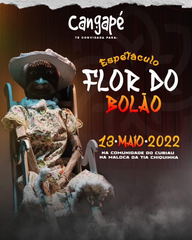 Nesta sexta-feira, a Companhia Cangapé realiza apresentação única do espetáculo “Flor do Bolão” no Centro Cultural Raízes do Bolão, no Curiaú. A apresentação especial faz parte da programação anual alusiva à data que ficou marcada na história pela assinatura da Lei Áurea em 13 de maio de 1888, a qual extinguiu oficialmente a escravidão no Brasil.