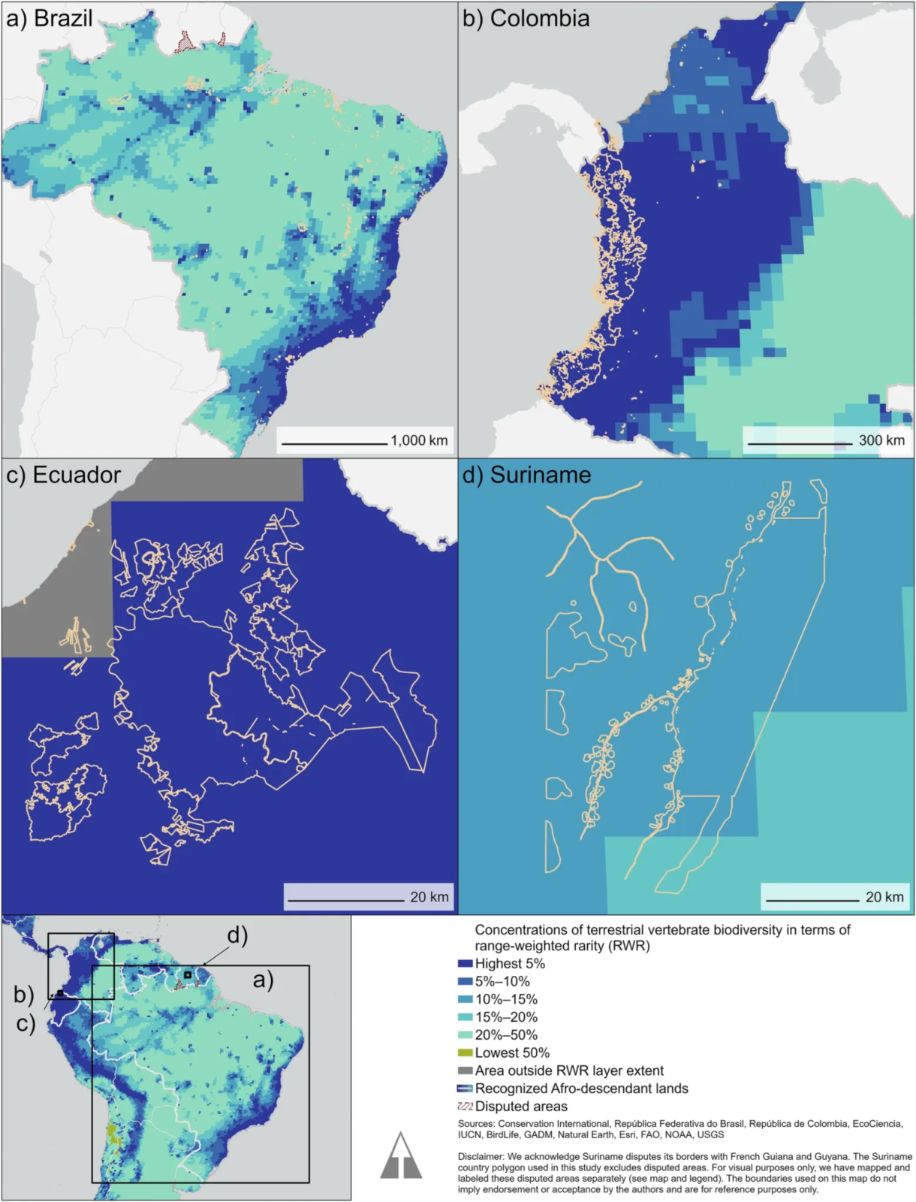Mapas do estudo mostram concentração de biodiversidade (á esquerda) e carbono irrecuperável nas terras quilombolas pesquisadas. Imagens: Afro-descendant lands in South America contribute to biodiversity conservation and climate change mitigation. Commun Earth Environ 6, 458 (2025).