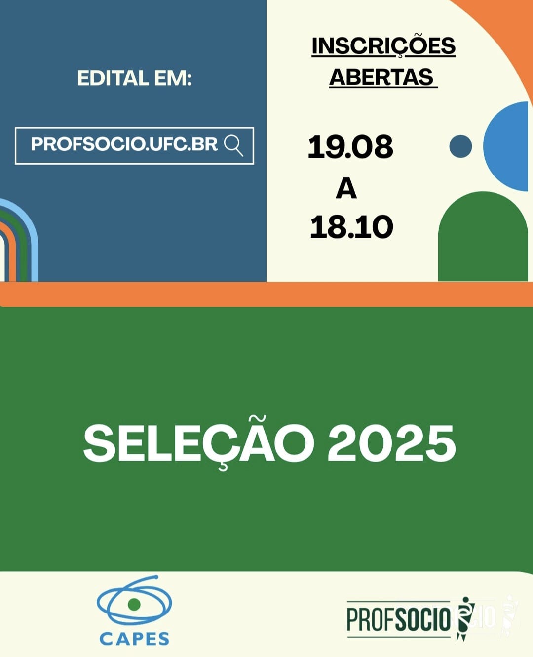 Inscrições: 19 de agosto até 18 de outubro de 2025, no site: https://profsocio.ufc.br/pt/processo-seletivo-2025/