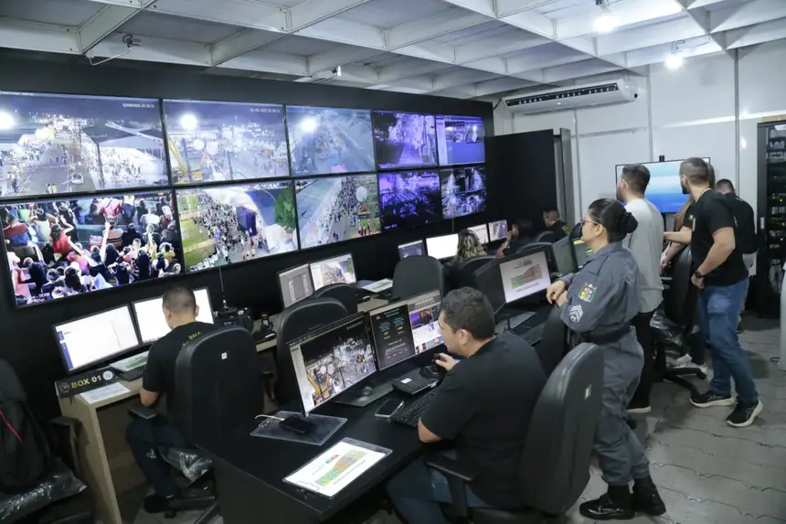 Mais uma vez, o Centro Integrado de Comando e Controle da Expofeira foi um dos destaques e estava equipado com inteligência artificial, 40 câmeras, entre as de longo alcance e as câmeras fixas, controle de tornozeleiras eletrônicas e integração direta com as equipes em campo.