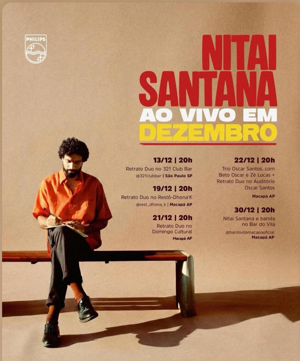 A agenda começa no dia 13 de dezembro, às 20h, com apresentação do Retrato Duo no 321 Club Bar, em São Paulo. Já no dia 19, também às 20h, Nitai segue para o Restô-Dhona’K, em Macapá, retomando sua presença no cenário local.