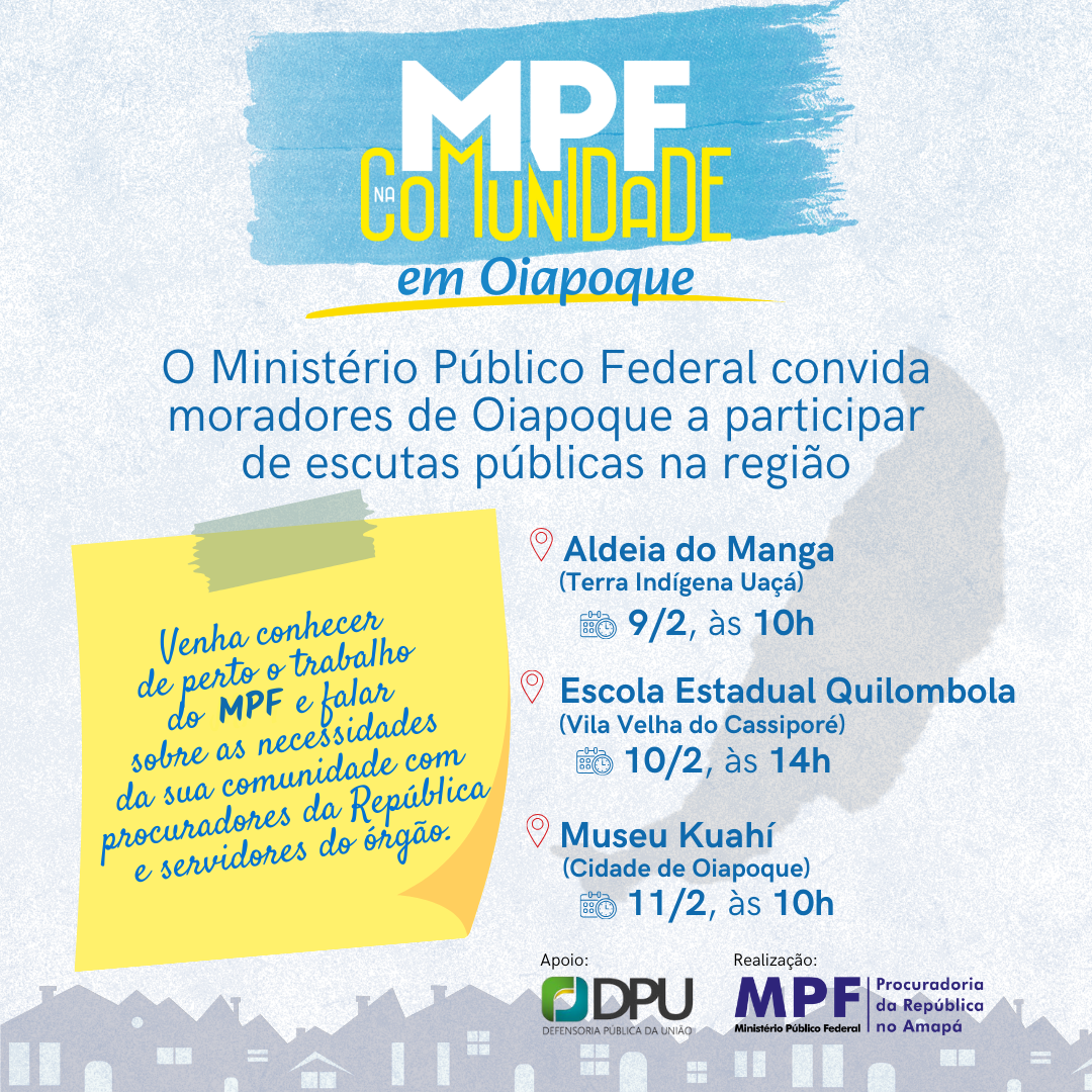 O encerramento das atividades ocorre na quarta-feira, 11 de fevereiro, na sede do município de Oiapoque. A reunião será realizada às 10h, no Museu Kuahí, aberta a toda a população que deseje registrar demandas ou buscar orientações junto ao Ministério Público Federal.