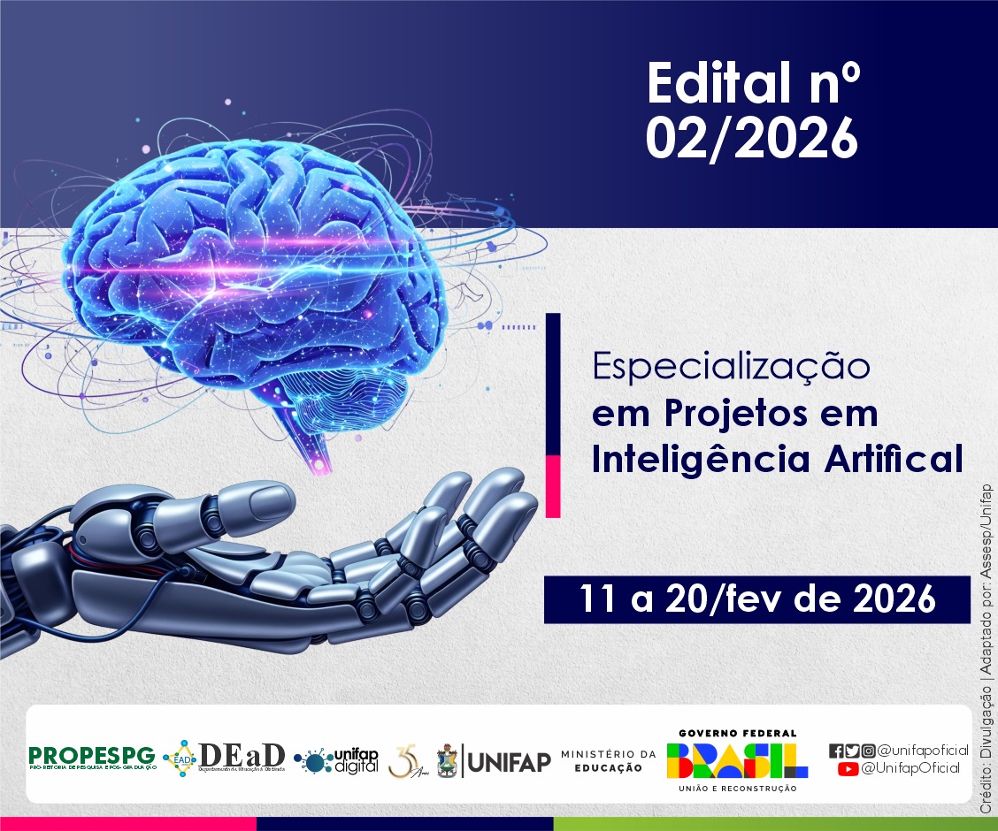 O curso de Especialização em Projetos em Inteligência Artificial é ofertado pela primeira vez na Unifap, pelo programa de extensão Unifap Digital e o Departamento de Educação a Distância (Dead), com apoio do Ministério da Integração e do Desenvolvimento Regional (MIRD).