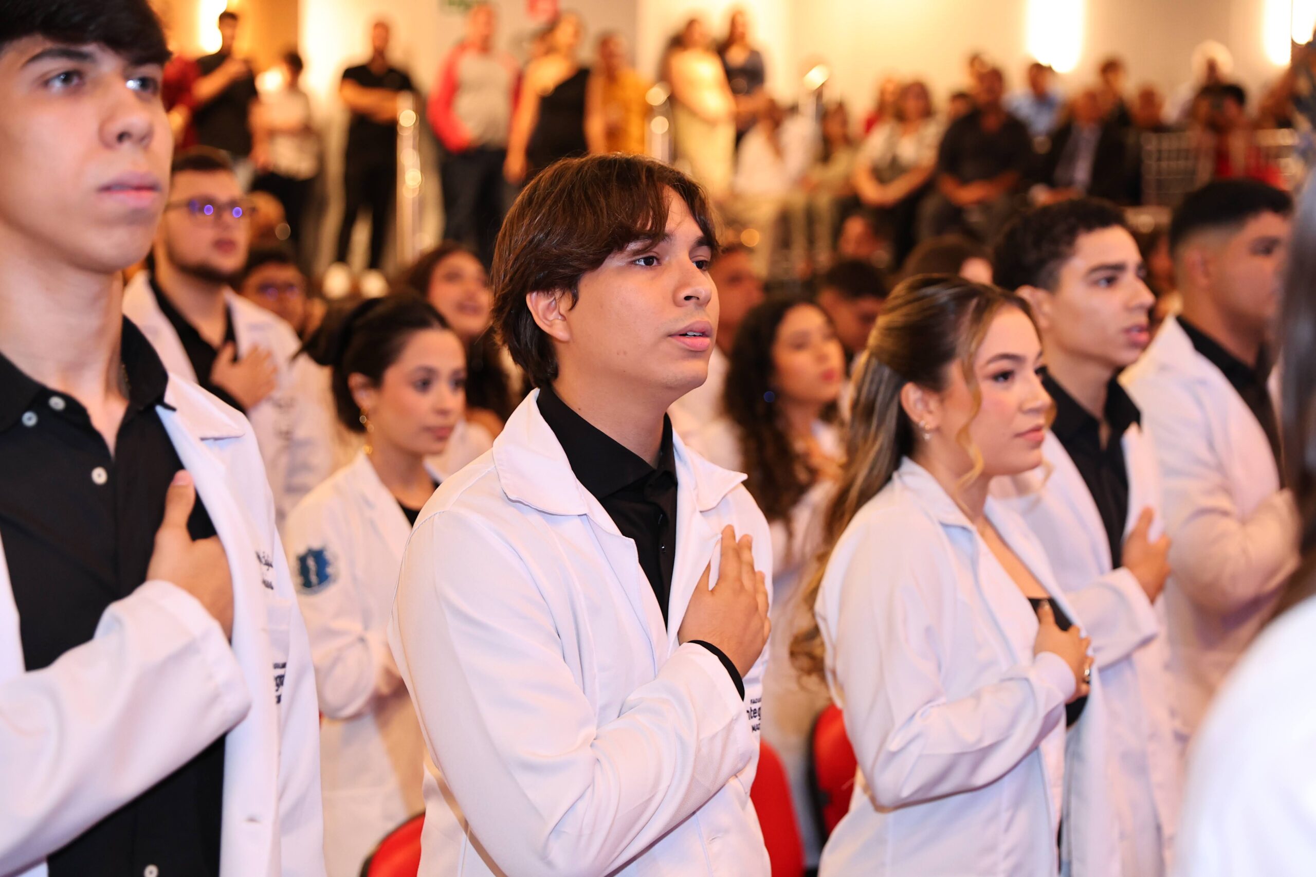 A solenidade reuniu 84 acadêmicos ingressantes, além de familiares, amigos, professores e representantes da diretoria da instituição. Durante o evento, os estudantes receberam o jaleco no palco, por alguém escolhido por eles, em um ato simbólico que representa a entrada na área médica e o início da preparação para o exercício profissional.